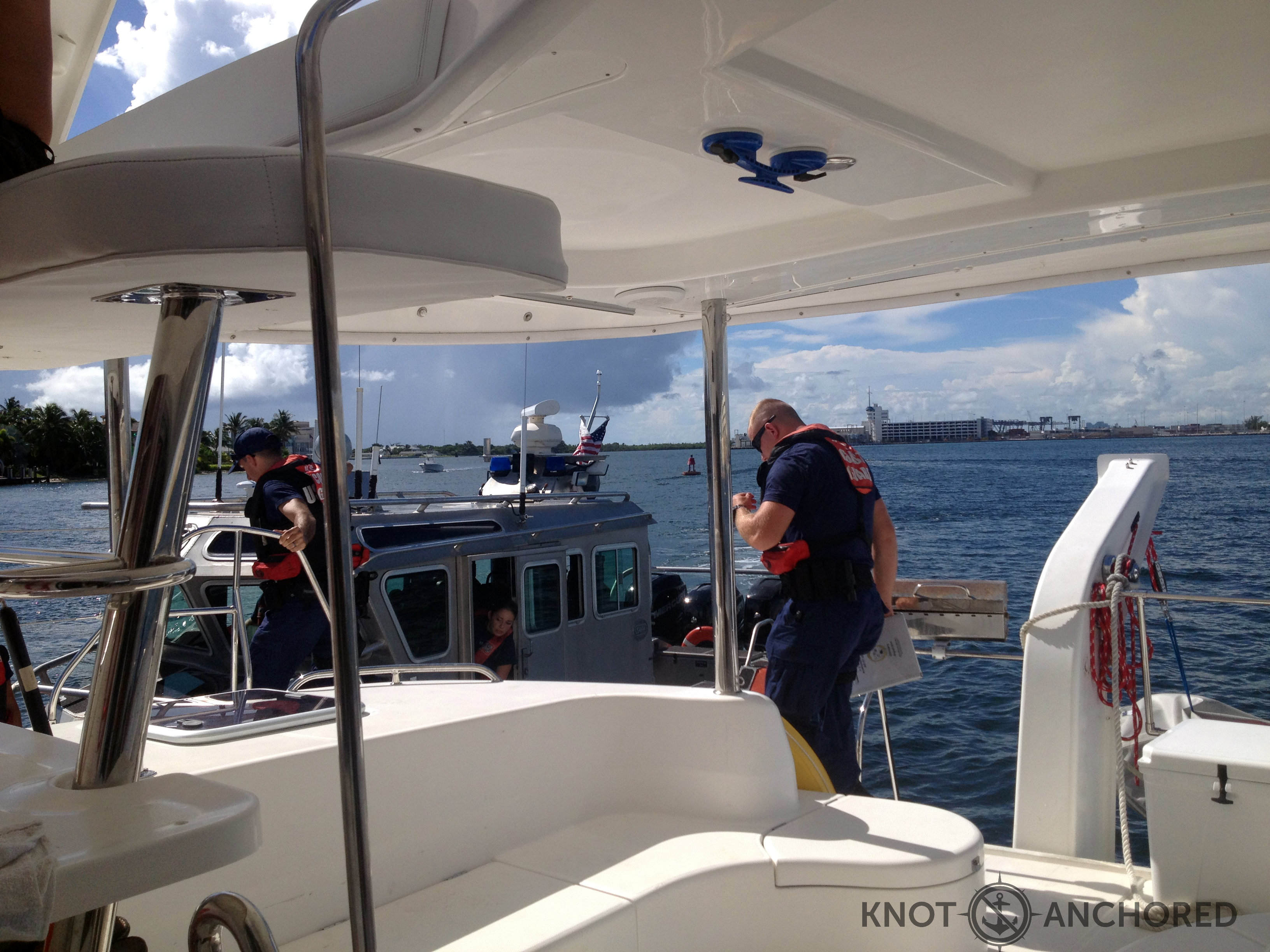 The Coast Guard boat pulls up alongside, ties on and then the guys come aboard. It’s a very formal procedure and you’re not really sure what to expect.
